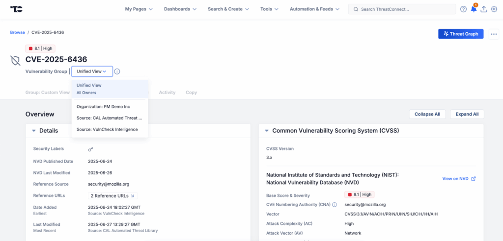 With ThreatConnect’s new data consolidation capability, users can quickly access all available information about a given vulnerability in one place. This consolidation happens automatically, starting with the most recently added vulnerabilities, and connects all data available about a given vulnerability across the different sources and feeds a user has available to them. With this capability, analysts can trust that when they visit a Vulnerability Details page in ThreatConnect, they are seeing all of the available information about that Vulnerability. All of the attributes, tags, and associations from the various sources and feeds the user has enabled are captured, cited, and displayed in a Unified View, providing a single page that can be used for contextualization.