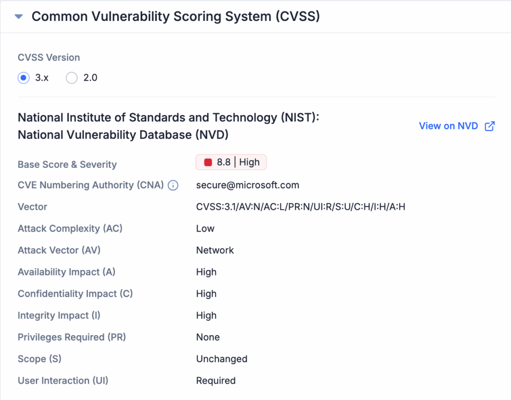 The data displayed in the CVSS card are pulled directly from the National Institute of Standards and Technology (NIST) National Vulnerability Database (NVD) and displayed in ThreatConnect for your convenience. If there is more than one CVSS version available for a given vulnerability, then the user will have the option to view the fields from each CVSS version by selecting one of the radio buttons next to the CVSS version number at the top of the card.