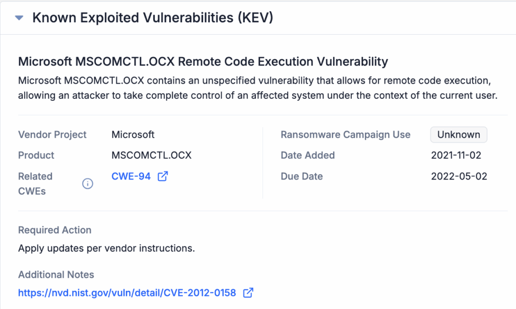 Similar to the CVSS information, KEV data is pulled directly from the U.S. Cybersecurity and Infrastructure Security Agency (CISA) Known Exploited Vulnerabilities Catalog. The data is displayed in the KEV card as shown below with links to related CWEs and additional notes, as available. This information is presented as provided by CISA, and does not undergo any additional validation or enrichment before being shown in the ThreatConnect UI.