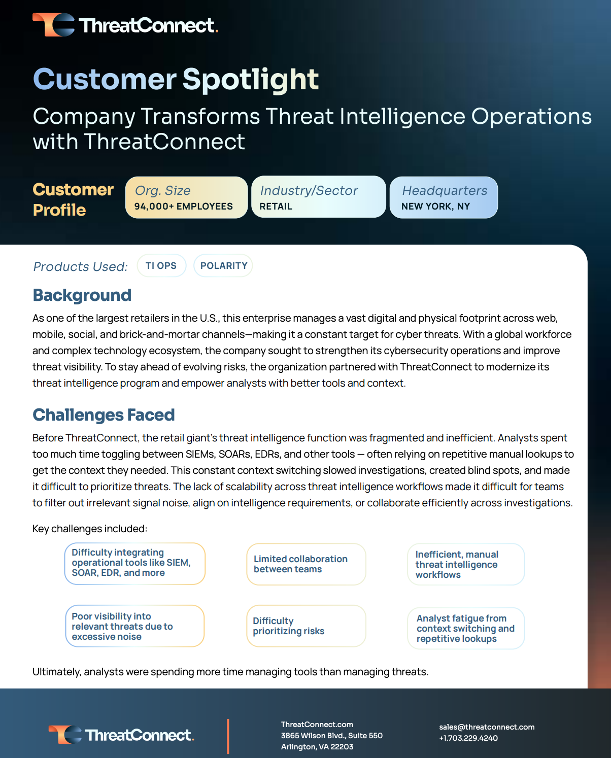 By partnering with ThreatConnect, the retailer revolutionized its threat intelligence operations. ThreatConnect’s TI Ops and Polarity tools streamlined workflows, reduced mean time to resolution (MTTR), and improved threat prioritization. Analysts benefited from automated intelligence collection, reduced false positives by 25%, and faster, more accurate investigations—all while minimizing fatigue and tool-switching.