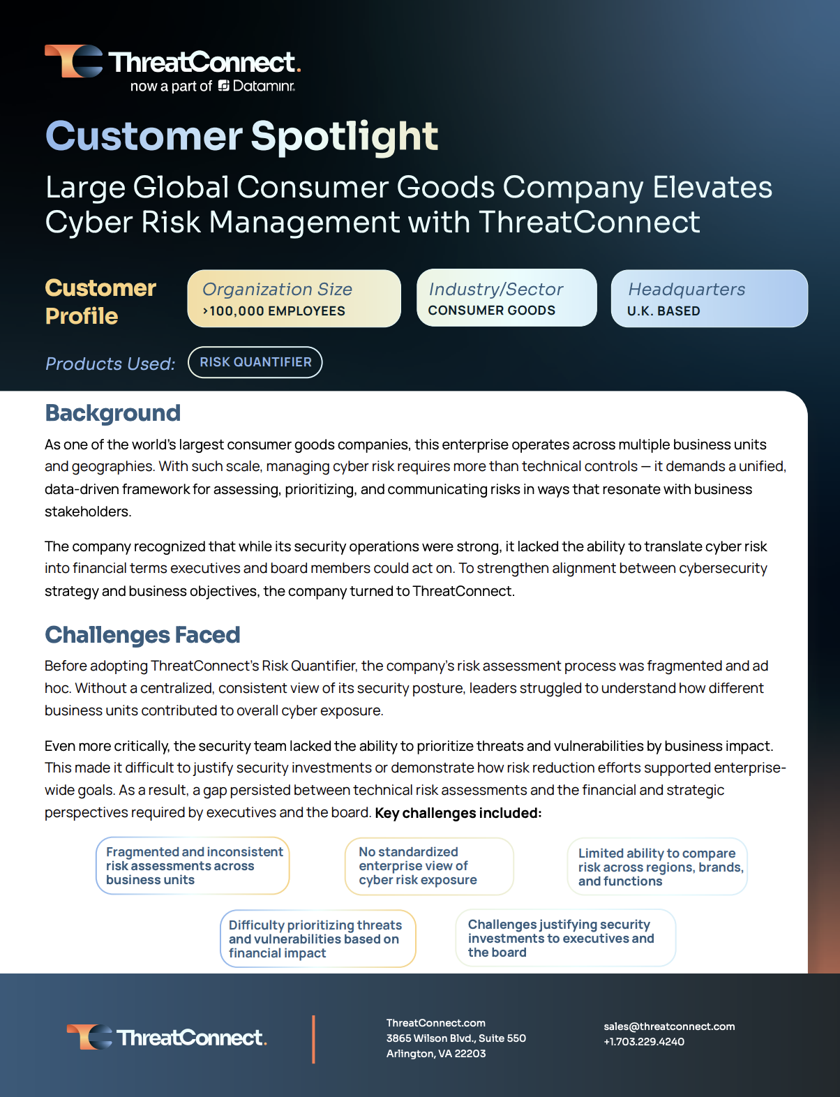 A leading global consumer goods company recently partnered with ThreatConnect to revolutionize its cyber risk management. By implementing ThreatConnect’s Risk Quantifier (RQ), the organization moved away from fragmented assessments toward a unified, data-driven cybersecurity strategy.